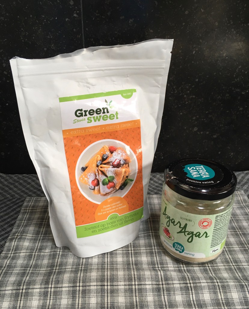 **Je kunt als zoetstof ook (riet)suiker gebruiken. Deze is van nature een bindmiddel en dan heb je geen Agar Agar nodig.