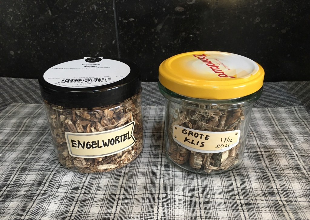 Neem ongeveer 1 eetlepel Engelwortel en 1 eetlepel Grote Klis.
