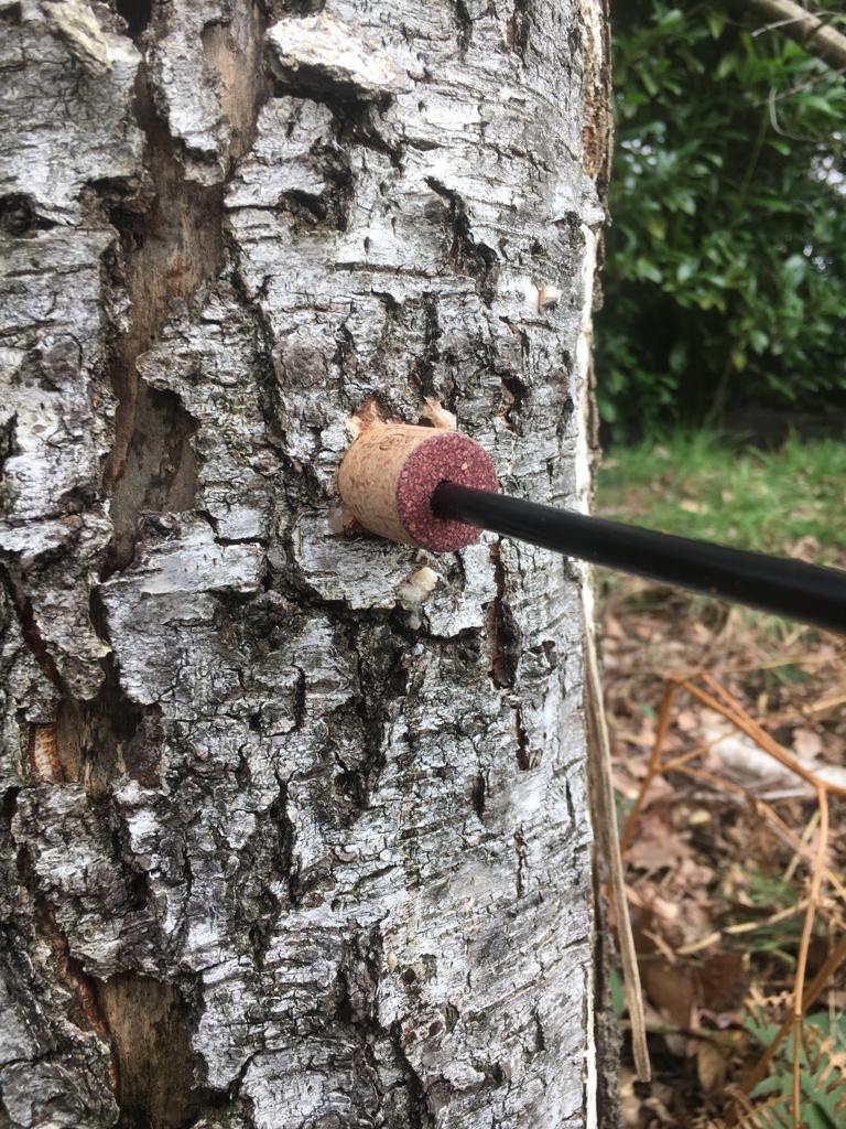 * Boor een gaatje in de stam van de berk van ongeveer 5 cm diep.
