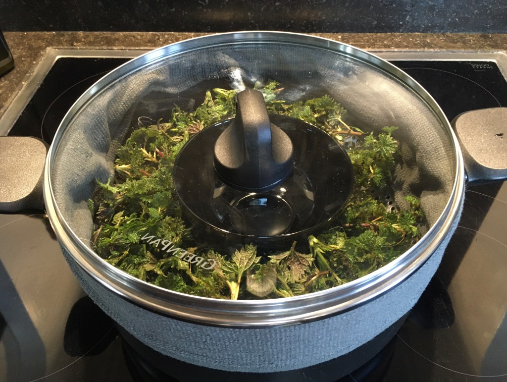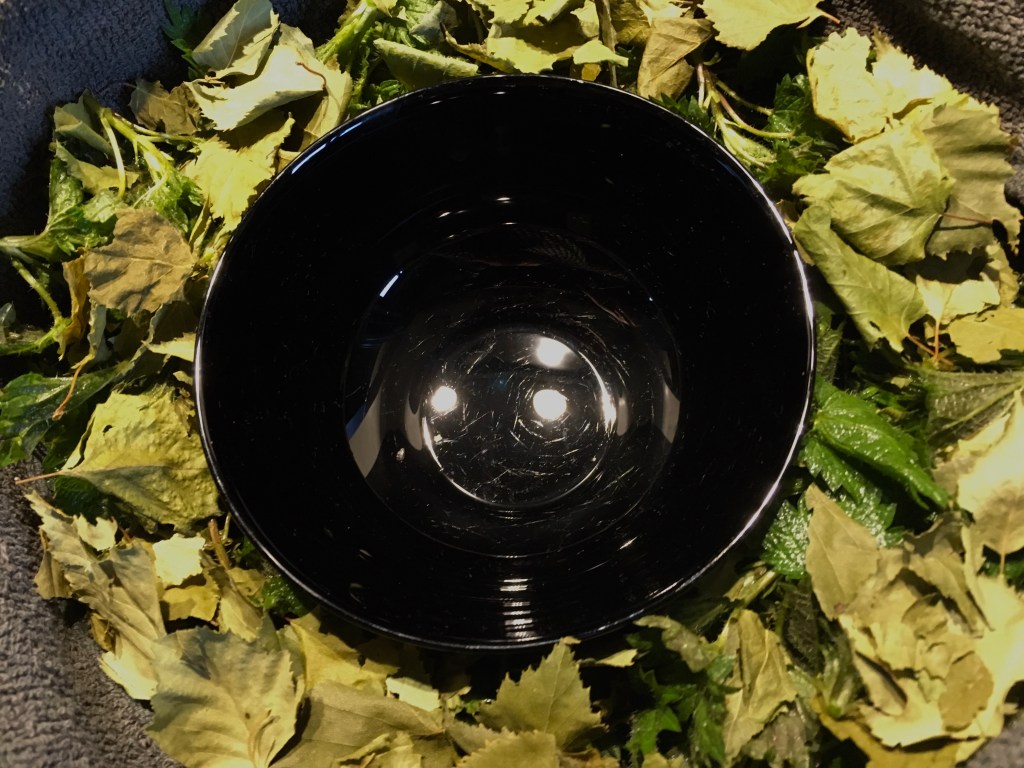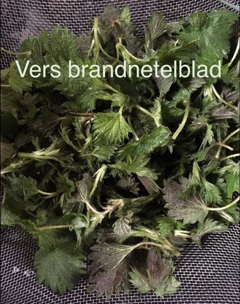 Ik heb -vorig jaar gedroogd- berkenblad en vers geoogst brandnetelblad gebruikt. Het verse brandnetelblad bevat dan wel wat water.