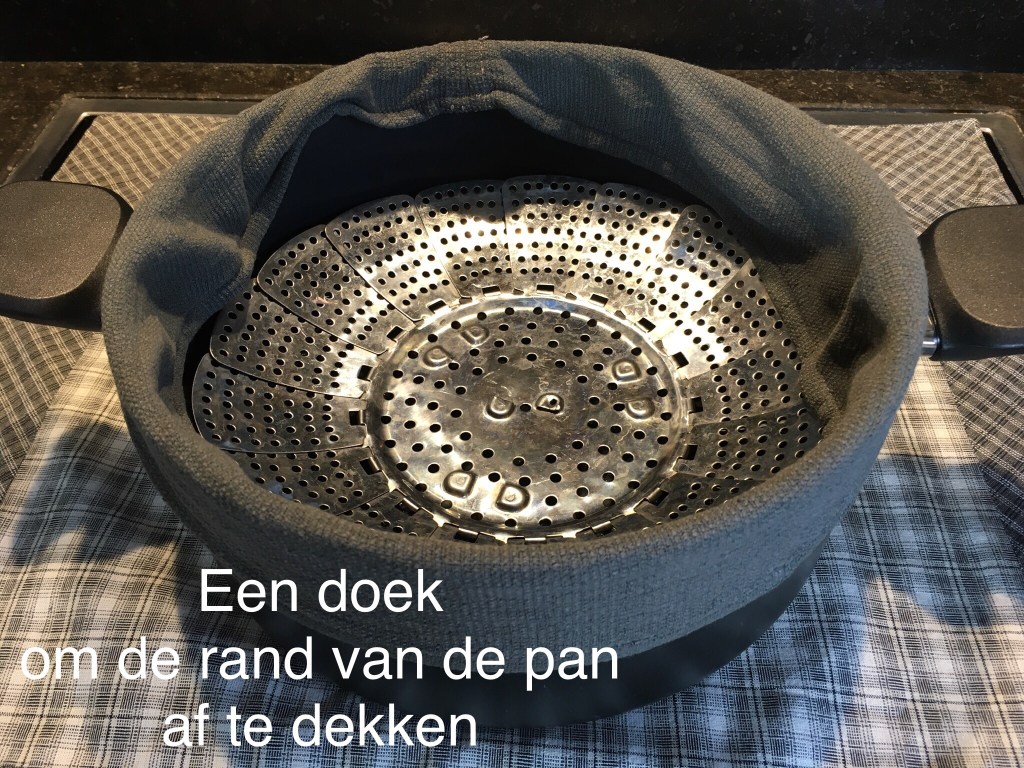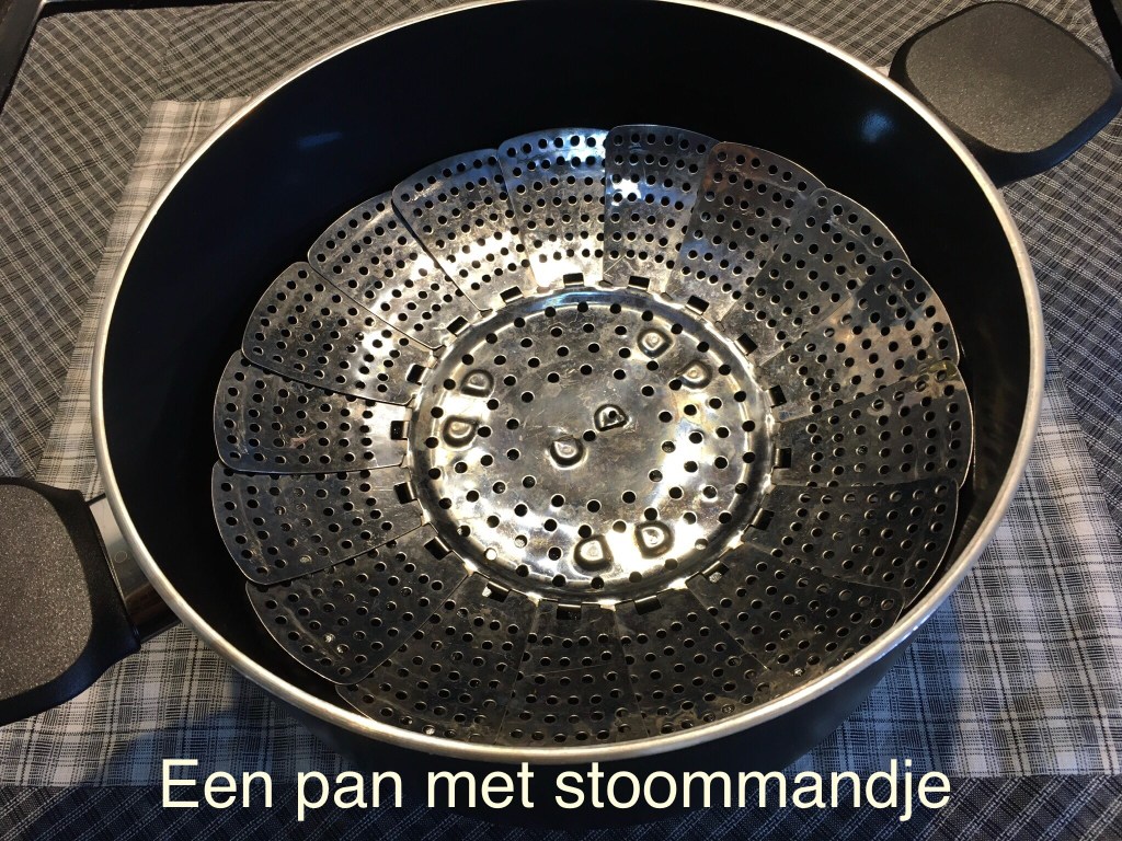 * Vul de pan met heet water tot net iets onder de rand van het stoommandje.