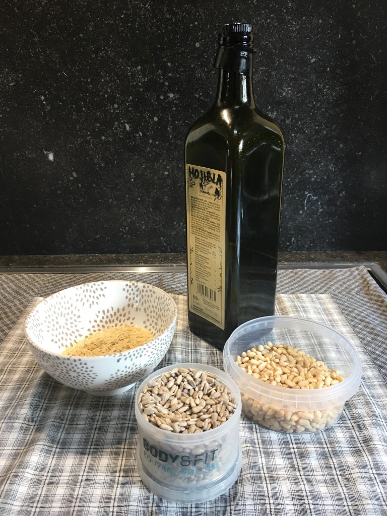 – Voeg de gemalen pitjes toe en wat zout, peper, knoflook(poeder) en edelgistvlokken (of Parmezaanse kaas) én eventueel nog wat extra olijfolie, en…