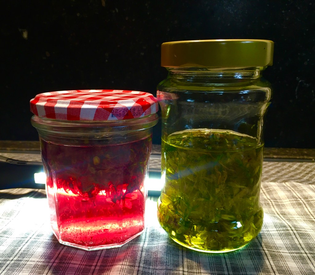 Neem je droge bloemen, dan kleurt de olie niet rood, maar blijft geel.