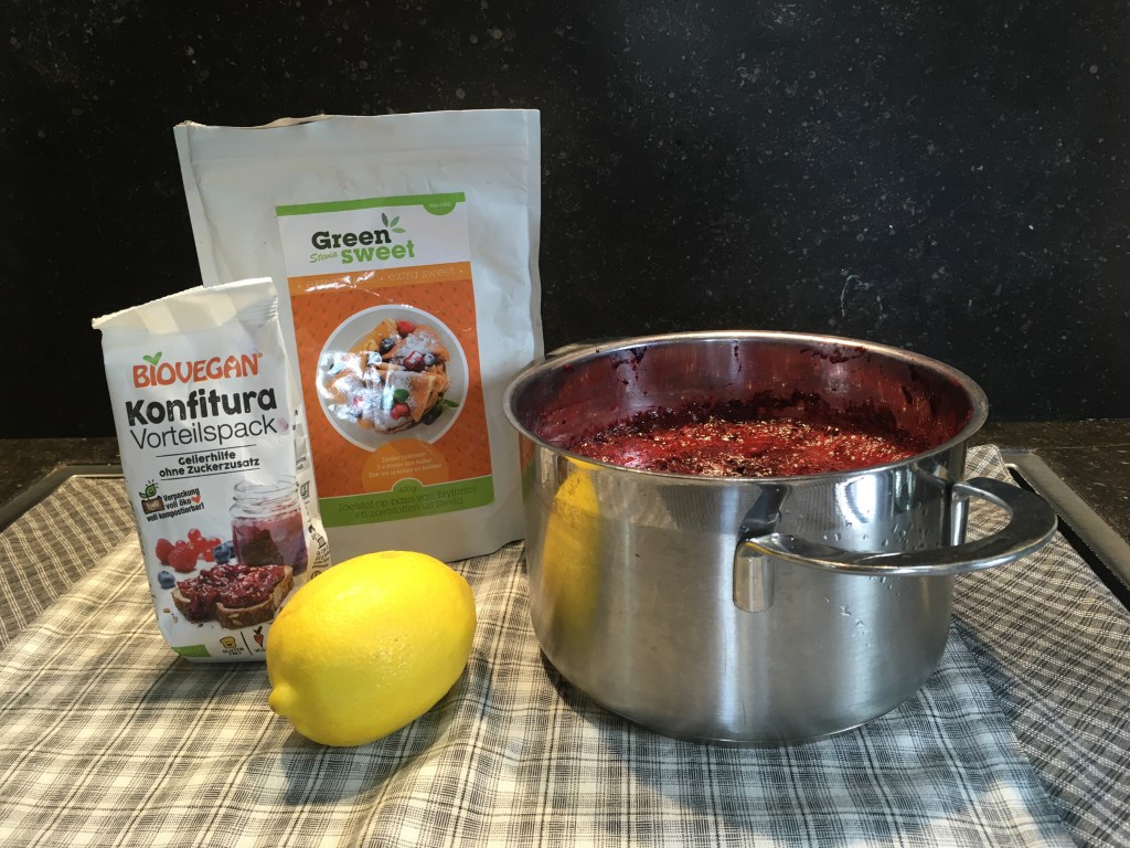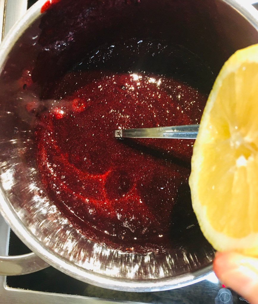 – Breng het sap/de puree met het citroensap, het water en de zoetstof (naar eigen keuze en hoeveelheid) aan de kook;