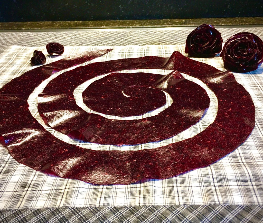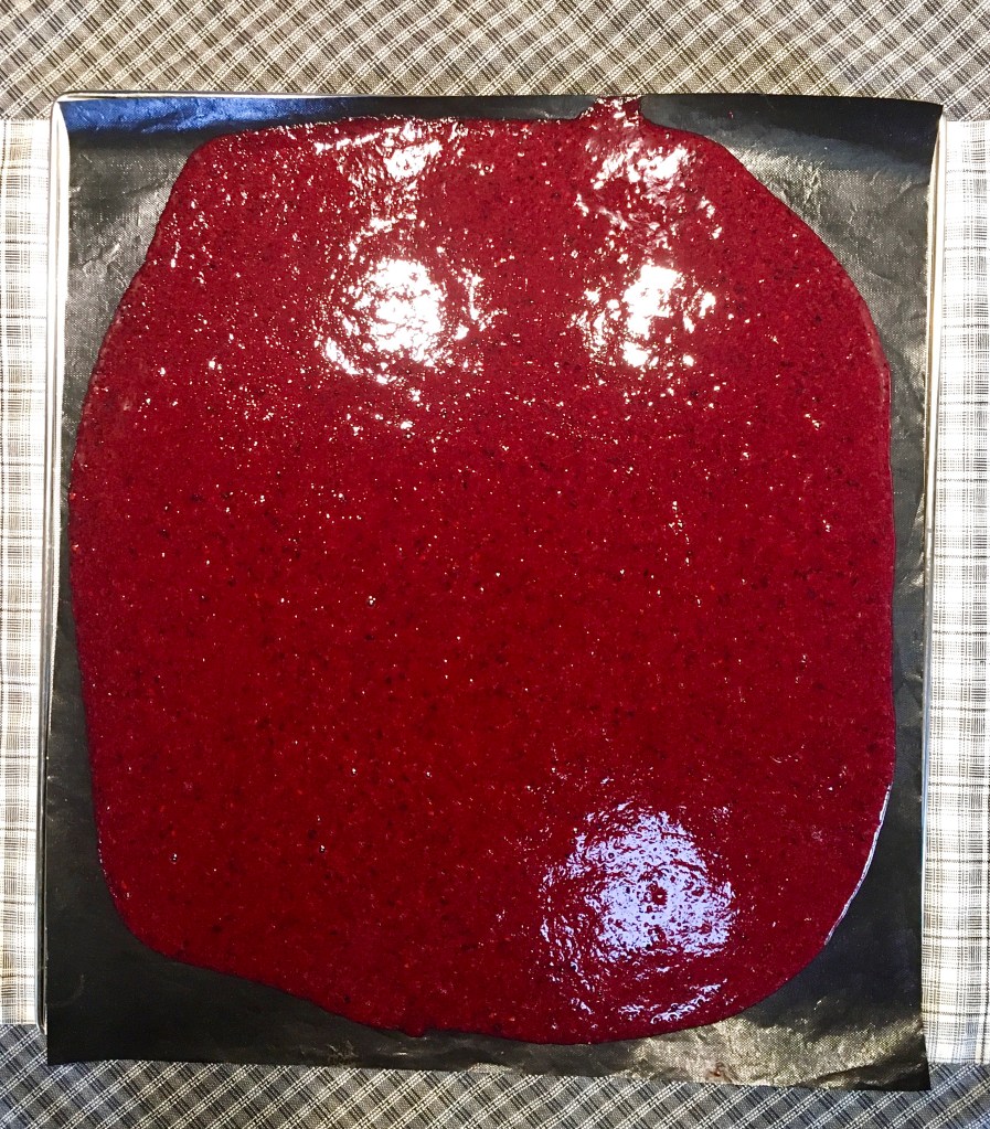 – Voeg ze toe aan de bramensaus en smeer de pulp uit over het siliconen matje van de voedseldroger (de hoeveelheid is genoeg om ongeveer drie matjes te bedekken).