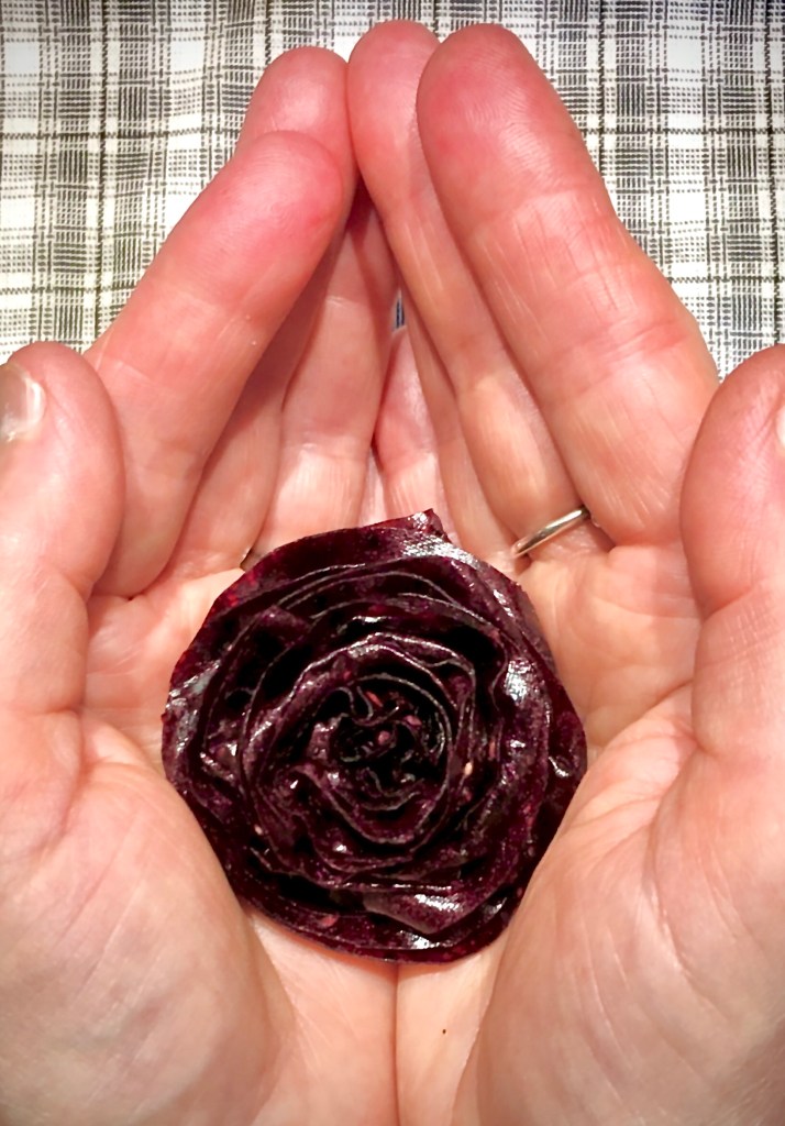 Je kunt van de restjes nog kleine roosjes maken, of oprollen en kneden tot snoepbolletjes. Heerlijk!