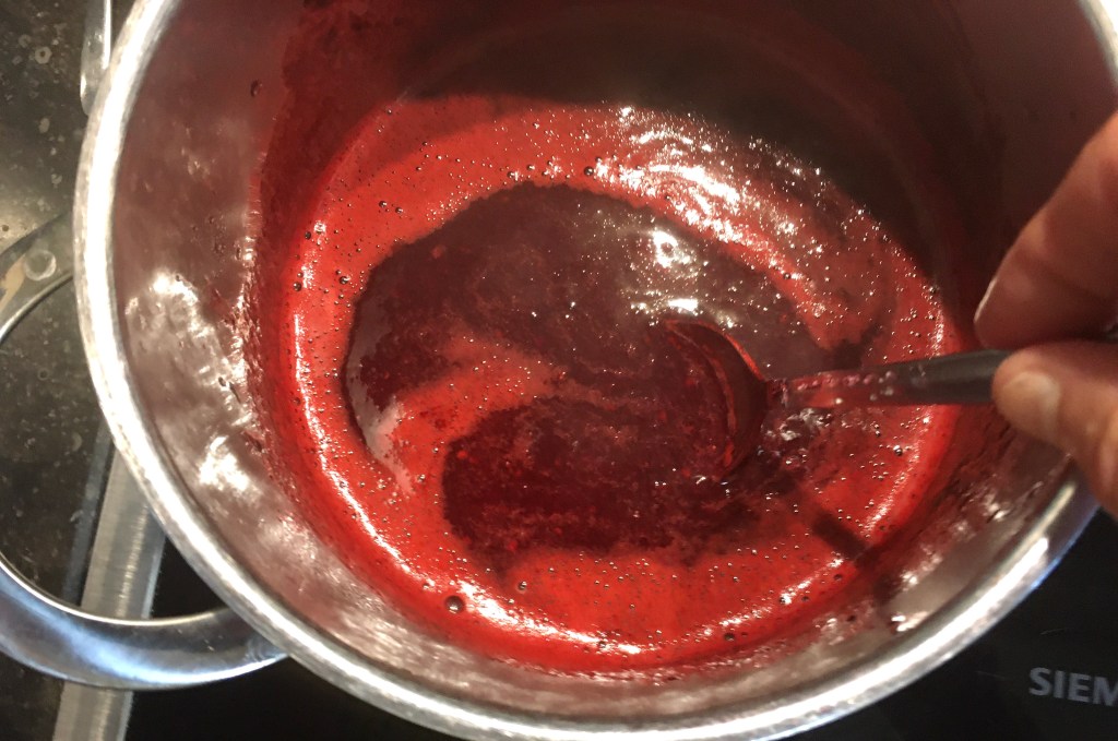 – Voeg in een pan al roerend beetje bij beetje de Konfitura bij het sap;