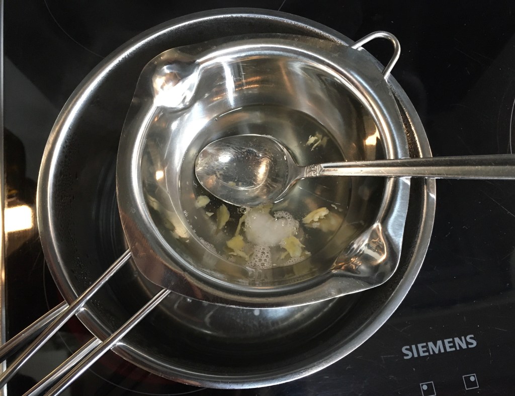 – Smelt de kokosolie en de bijenwaskorrels ‘au bain marie’…