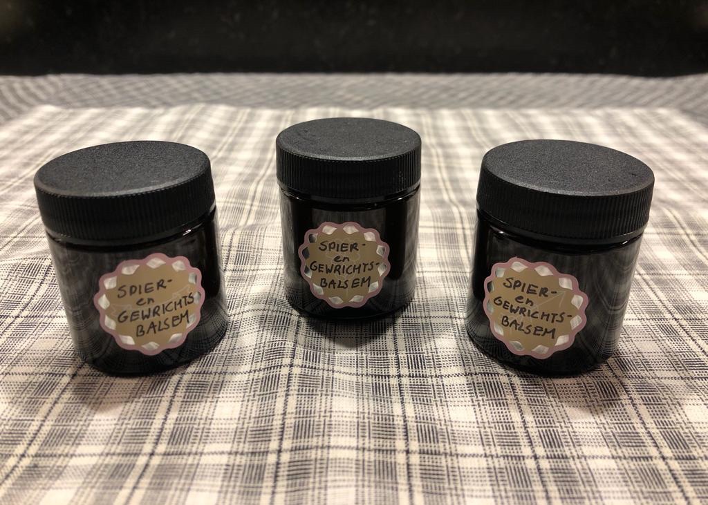 – Tot slot schenk je de nog vloeibare zalf in potjes, en…