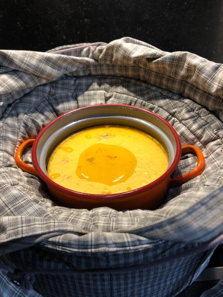 – Als alle was gesmolten is, laat je de pan langzaam afkoelen. Dit kan bijvoorbeeld in een styropor of ‘piepschuim’ doos.