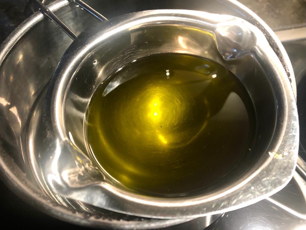 Doe dit niet als de temperatuur nog te hoog is, want dan vervliegt een deel van deze kostbare olie, en dat is jammer!