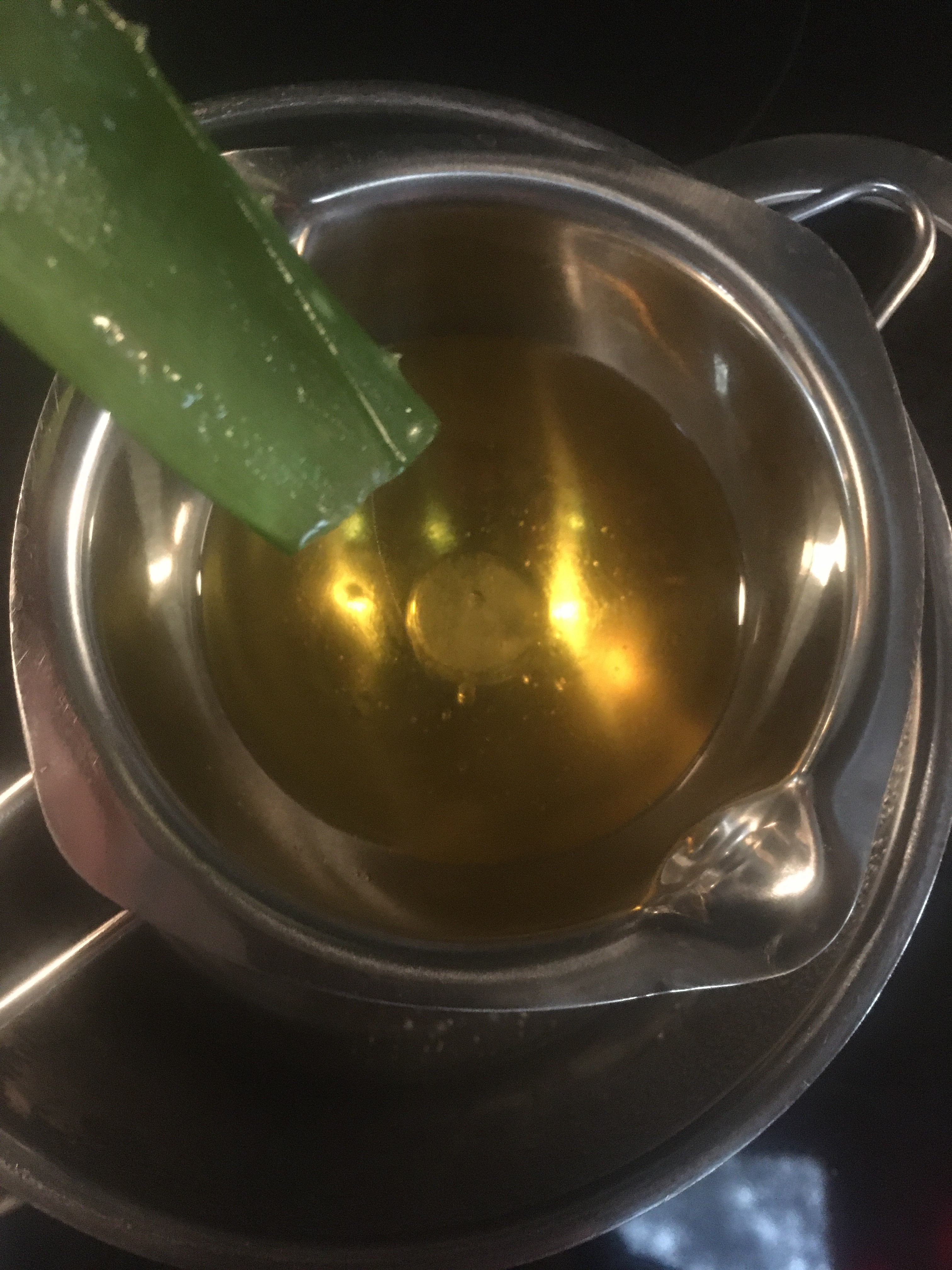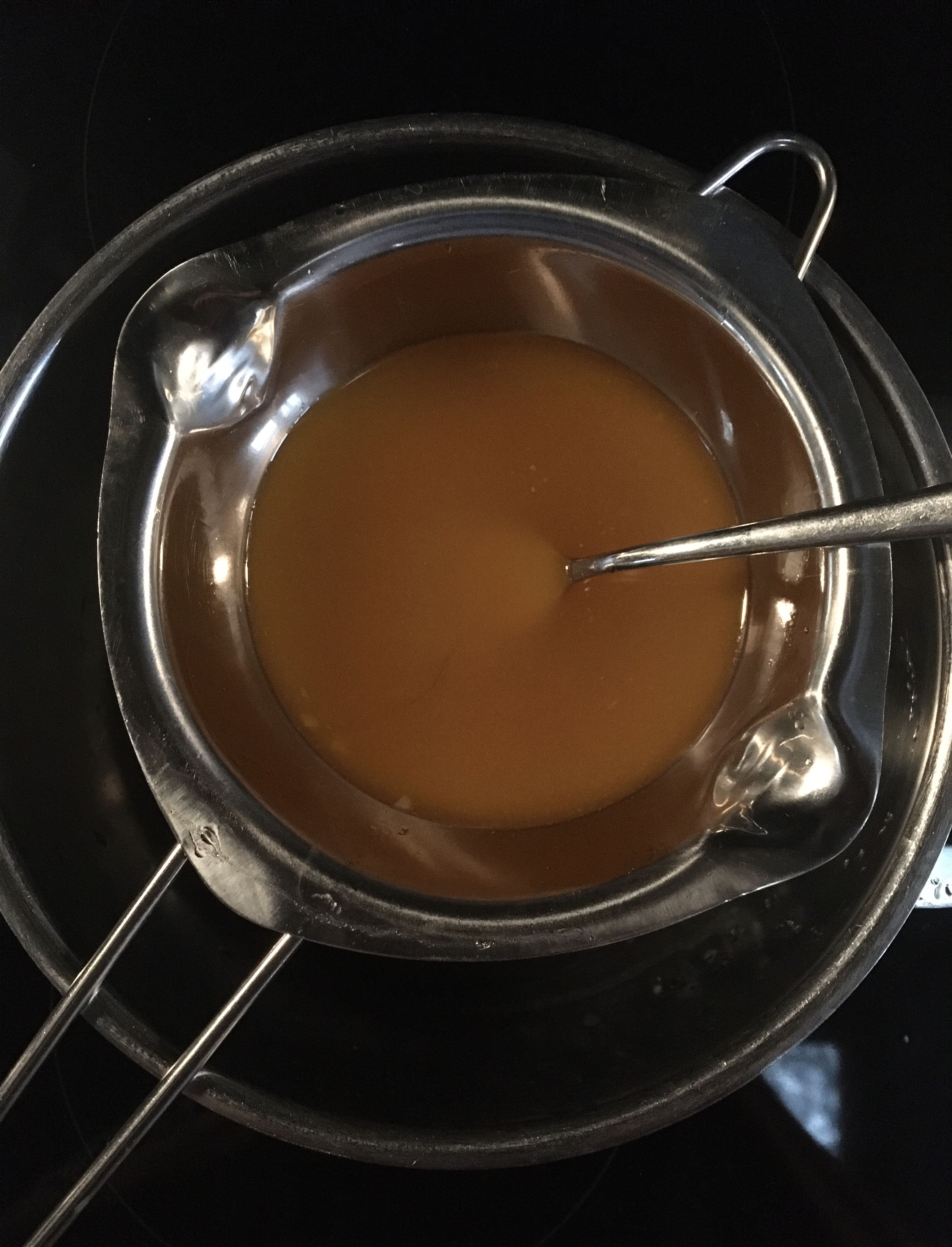 Als je mengsel is afgekoeld tot zo’n 40 graden kun je de door jou gewenste etherische olie toevoegen – ik heb Roos, Jasmijn en Bergamot gebruikt – en…